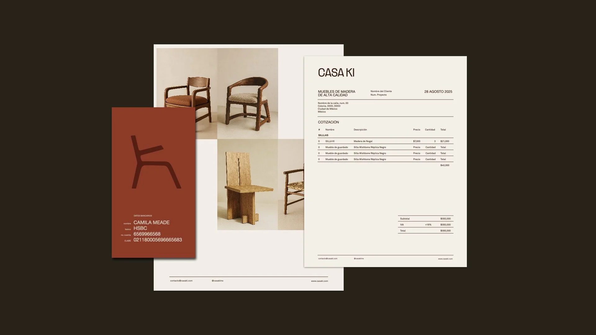 El objetivo del branding fue traducir la esencia de Casa Ki en una identidad visual y narrativa coherente, transmitiendo su elegancia, funcionalidad y carácter atemporal. Buscó reforzar su posicionamiento como una marca de mobiliario de alta gama para un público exigente, mediante un lenguaje gráfico minimalista, materiales nobles y una comunicación que evoque calidez, exclusividad y sofisticación.